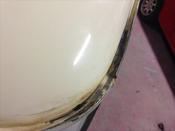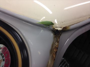 | やはり、あちこち錆が出てますね 怪しかった右側は、左より大きく穴あいてました 13インチ系のフロントフェンダーは、ほとんど錆出てますね |