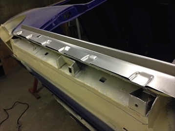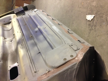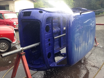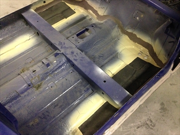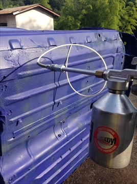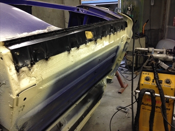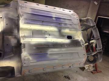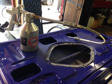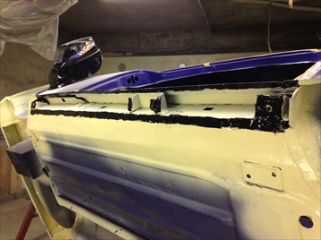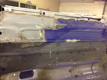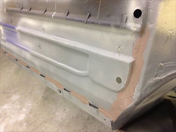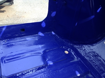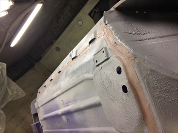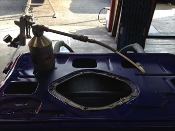 外装廻りの錆処理、板金も完了し、パワー防錆で防錆処理 この後、サフェーサーをペイントし、下地作業が完了です |