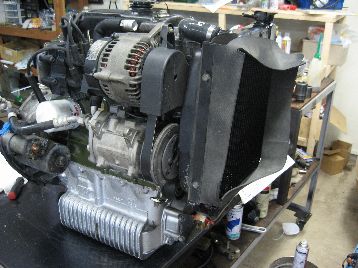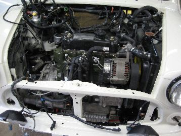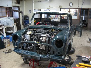 完成したエンジンミッションをエンジンルームに収めます 外した外装部品も先に取り付けしています |