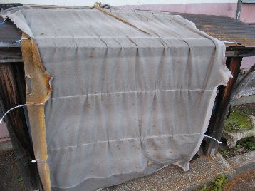 外した天張りです 97y以降の天張りは、ほぼこの様な状態です スポンジもボロボロになり 素材が目の粗い布の様な生地なのでホコリを吸い込んでしまうのでしょう エアーフィルタの様に汚れてしまっています |