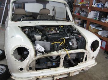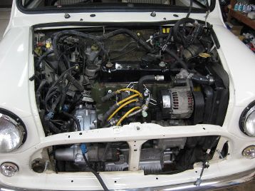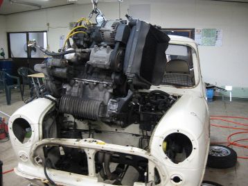 お待たせしました、板金、塗装の体制が整いましたので、作業再開です エンジン、ミッションを降ろします |