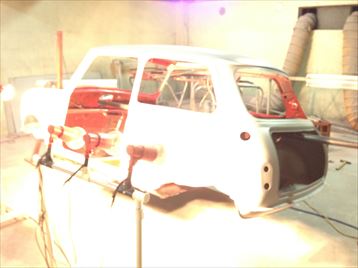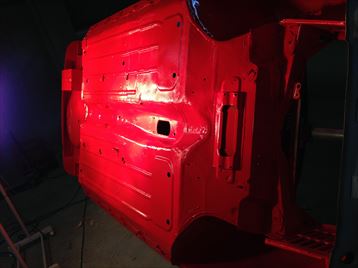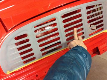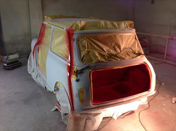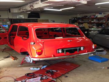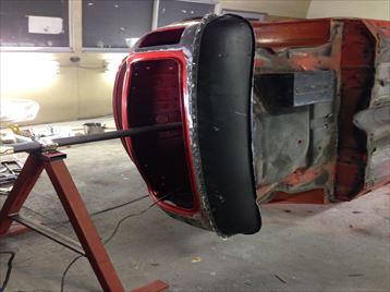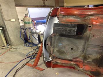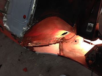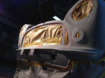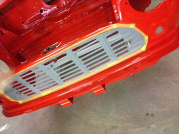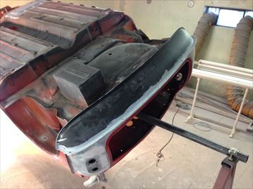 | リヤのバランスパネル交換 錆の出やすい部分なので、ボディ、パネル共に防錆の下塗りをしてから取り付けます 元々、雨水が床側から入りここ部分が錆びてしまいますので、パネルの継ぎ目は、シーラーでビッチリ塞ぎます ひっくり返さなければここまでしっかり出来ません やっぱりこれは正解!! MKー1テールも同時に進めています |