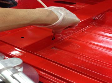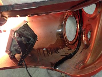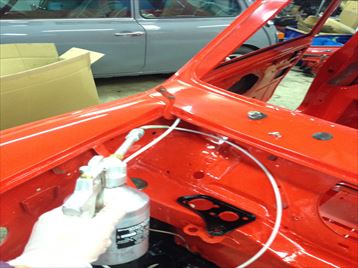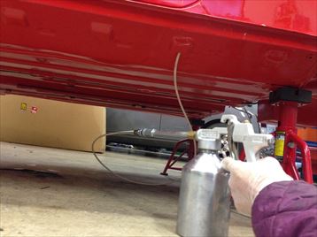 | 袋状になっている錆の出やすい箇所は、waxoyl、hardwaxで徹底的に防錆処理を行います この作業、自分で写真を撮るのは以外に苦労します(笑 |