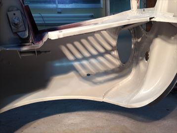 | フェンダーの中 隙間はMe500で錆止め処理 その上に防錆の下塗りを行い仕上げにシーラーで水の入るのを防ぎます ここまでやれば、当分は大丈夫! 綺麗に下地が終わりました |