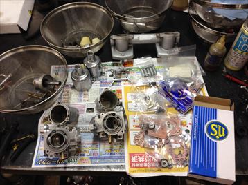 | エンジン廻りの組み付け中 とか、言いながら写真撮って満足してるだけ(笑 この車両を、1人で黙々と組み付けしながら何度「いいねぇ!」と言ったか覚えていませんが、毎日一回は確実に言ってます! 作業出来ない日も言ってます(笑 |
